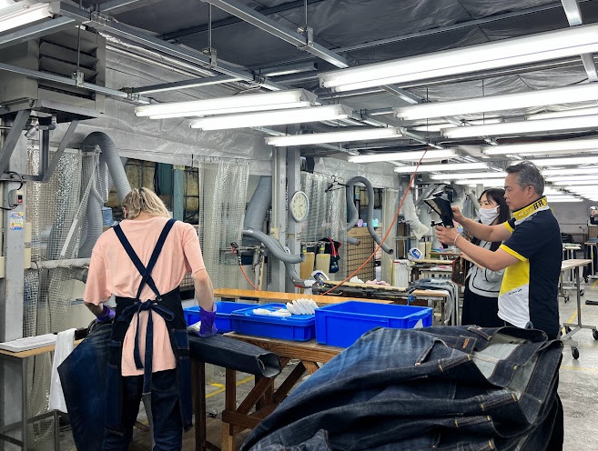 At TCB Jeans & Co., the tour heard from company president Mr. Hajime Inoue about his background, what led to establishing the TCB Jeans brand, and an overview of the company. The group then looked around the store and the sewing factory, interviewing employees and taking many photos and videos of the factory. The journalists asked Mr. Inoue about jean designs, the general age of the company’s customers, overseas markets, and why he likes jeans.