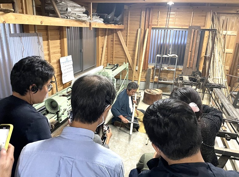 The tour visited Sugita Seiren, one of the few workshops that makes Osaka Kongo sudare, which has been designated as a traditional craft by the national government. At the Sudare Museum near the workshop, also made by Sugita Seiren, the tour heard from Mr. Hiromasa Moriguchi, director of the Osaka Sudare Cooperative Association, about the history of sudare and the tools and machines used to make them. Next, at the workshop the tour heard from Sugita Seiren president Mr. Koichi Sugita, who has made sudare for years and was recognized as a Notable Skilled Worker (Contemporary Master Craftsman), about processes such as splitting bamboo and weaving the thin bamboo strands together using a machine. The journalists intently filmed and photographed these demonstrations. At Mr. Sugita’s home, where numerous sudare are hung, he spoke about the decline in demand for sudare due to the popularization of air conditioning, and about the lack of the next generation of artisans, and support from the government. The journalists seemed impressed by Mr. Sugita’s craftsmanship, and his strong desire to keep those skills alive.