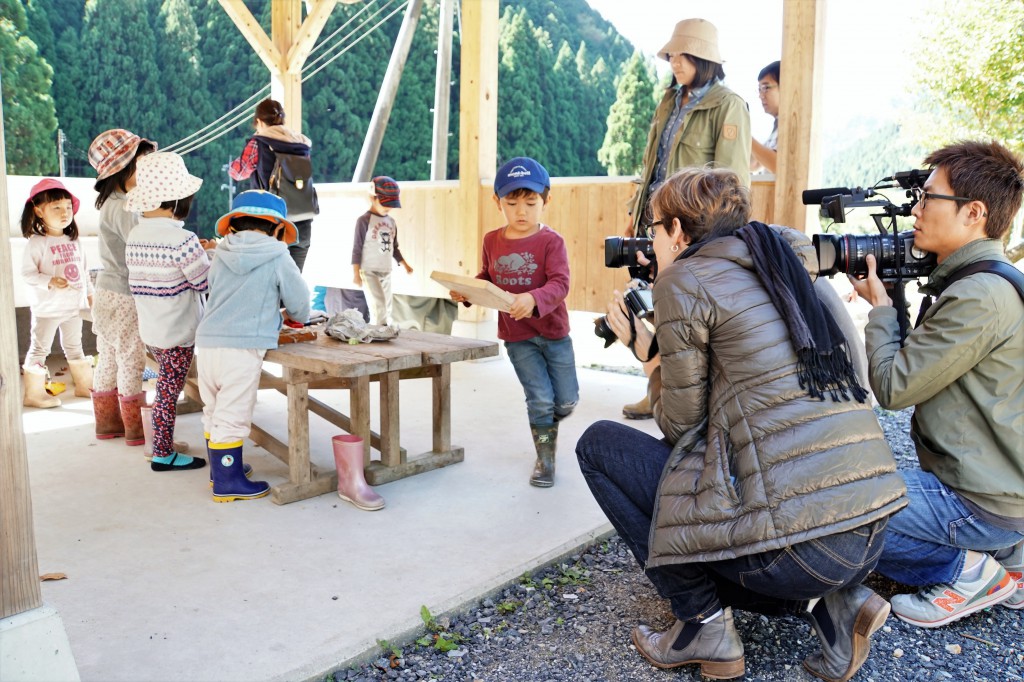 Forest kindergartens, where the children play outside in nature instead of inside a building, are one factor encouraging people to relocate to Tottori. The journalists visited a campground in the town of Chizu in the morning, where the children were splitting logs and cutting vegetables to cook lunch. Some journalists taped interviews with the children directly. In the afternoon, after interviewing Ms. Saeko Nishimura, the director of Marutanbo Forest Kindergarten, the journalists visited a share house that is available as temporary housing for families interested in sending their children to Marutanbo, and interviewed the current residents. The journalists asked Ms. Nishimura what other reasons she would give for relocating to Chizu aside from forest kindergartens, whether accidents occur while students are out in the forest, how Marutanbo students handle being in groups once they move on to elementary school, and how Marutanbo differentiates itself from the competition.