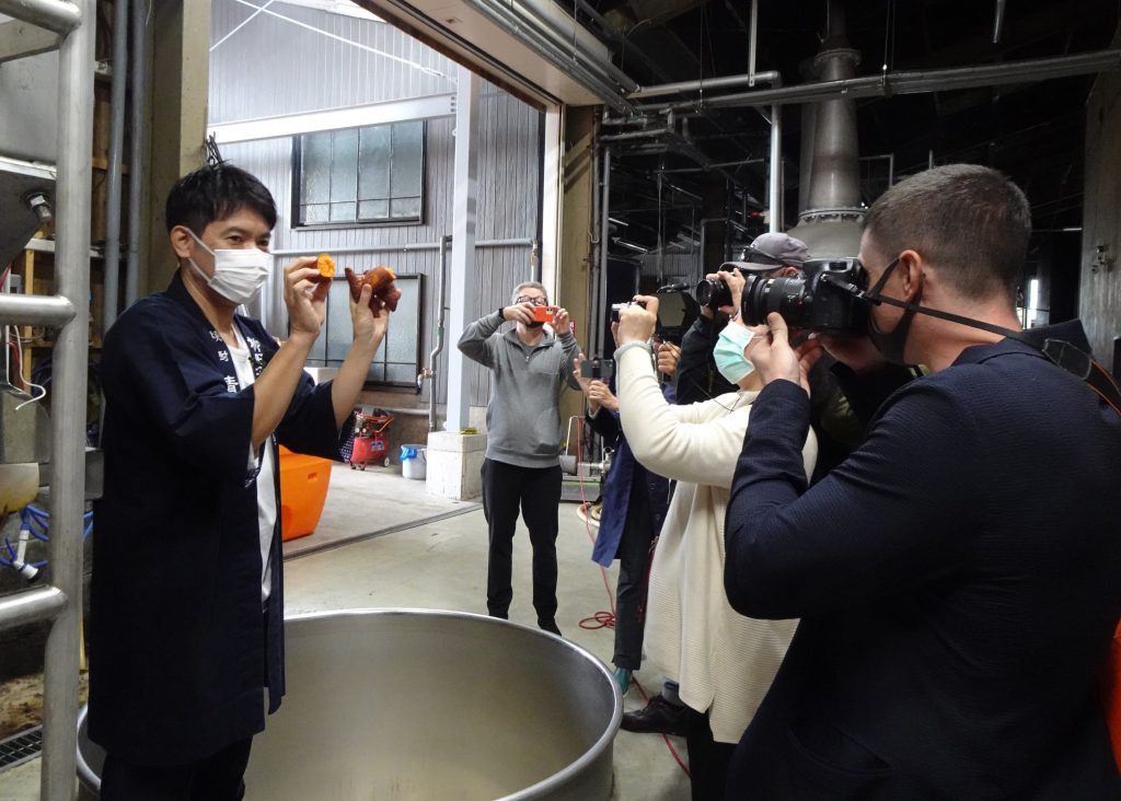 Yanagita Distillery has been making shochu from barely and sweet potatoes for the past 120 years. The fifth-generation owner, Mr. Tadashi Yanagita, spoke to the journalists about his passion for making shochu after quitting his job as an engineer to take over the family business, and also his efforts to develop products to appeal to foreign markets. After experiencing how the ingredients and distillation methods change the flavor of shochu (with a tasting), the group toured the sweet-smelling interior of the distillery, getting to taste some of the freshly steamed sweet potatoes used to make shochu and seeing the secondary moromi (mash) of some recently prepared potato shochu bubbling away as it fermented in a tank. The journalists asked a variety of questions, about initiatives to increase export sales and the impact of the COVID-19 pandemic.