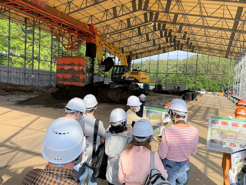 The tour visited the Interim Storage Facility, which was built to provide a safe, centralized place to manage and store removed soil and waste produced by decontamination efforts in Fukushima Prefecture until it can be permanently disposed of. While listening to explanations by a Ministry of the Environment official, the journalists saw the Soil Separation Facility and Soil Storage Facilities, and took many photos and videos of the large numbers of heavy machinery in action.