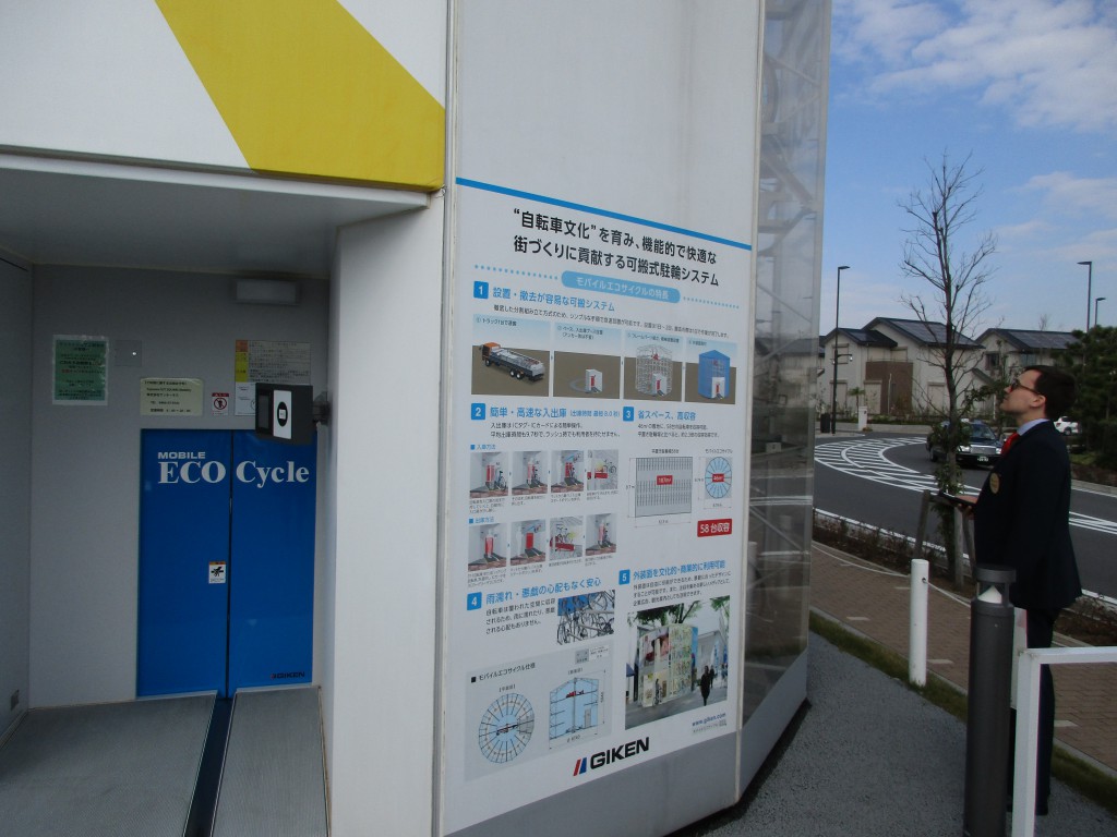 (写真:スマートタウンで電動アシスト自転車のシェアサービスを視察する記者)
