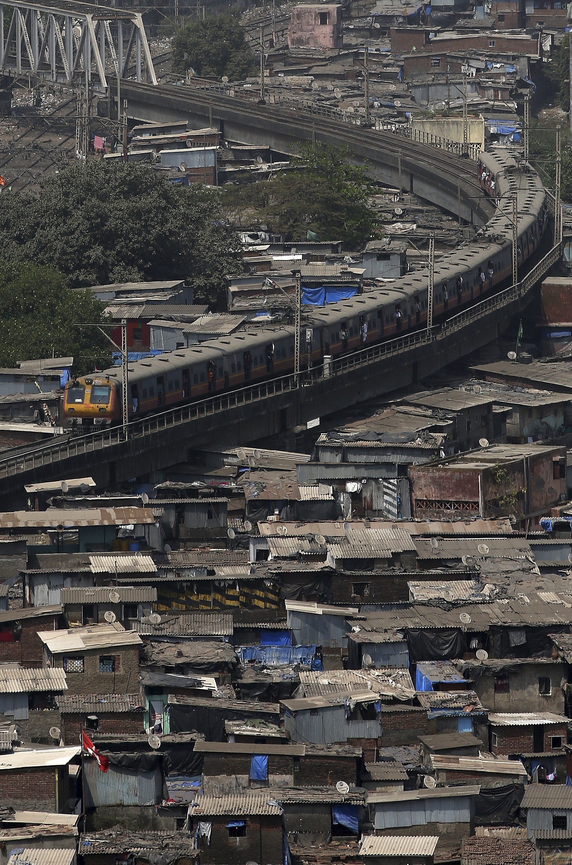 FILE – In this Feb. 25, 2015 file photo, a Mumbai suburban train passes by a slum in Mumbai, India. Prime Minister Narendra Modi hopes the visit this weekend, starting Friday, Dec. 11, 2015, by Shinzo Abe will be a major step in transforming India into an economic powerhouse with Japans help in building bullet trains, smart cities and accessing nuclear technology. India and Japan are set to sign a $15 billion agreement for a high-speed train linking the Indian financial hub of Mumbai with Ahmadabad, the commercial capital of Modi’s home state, Gujarat. The train would cut travel time on the 505 kilometer (315 mile) route from eight hours to two. (AP Photo/Rajanish Kakade, File)
