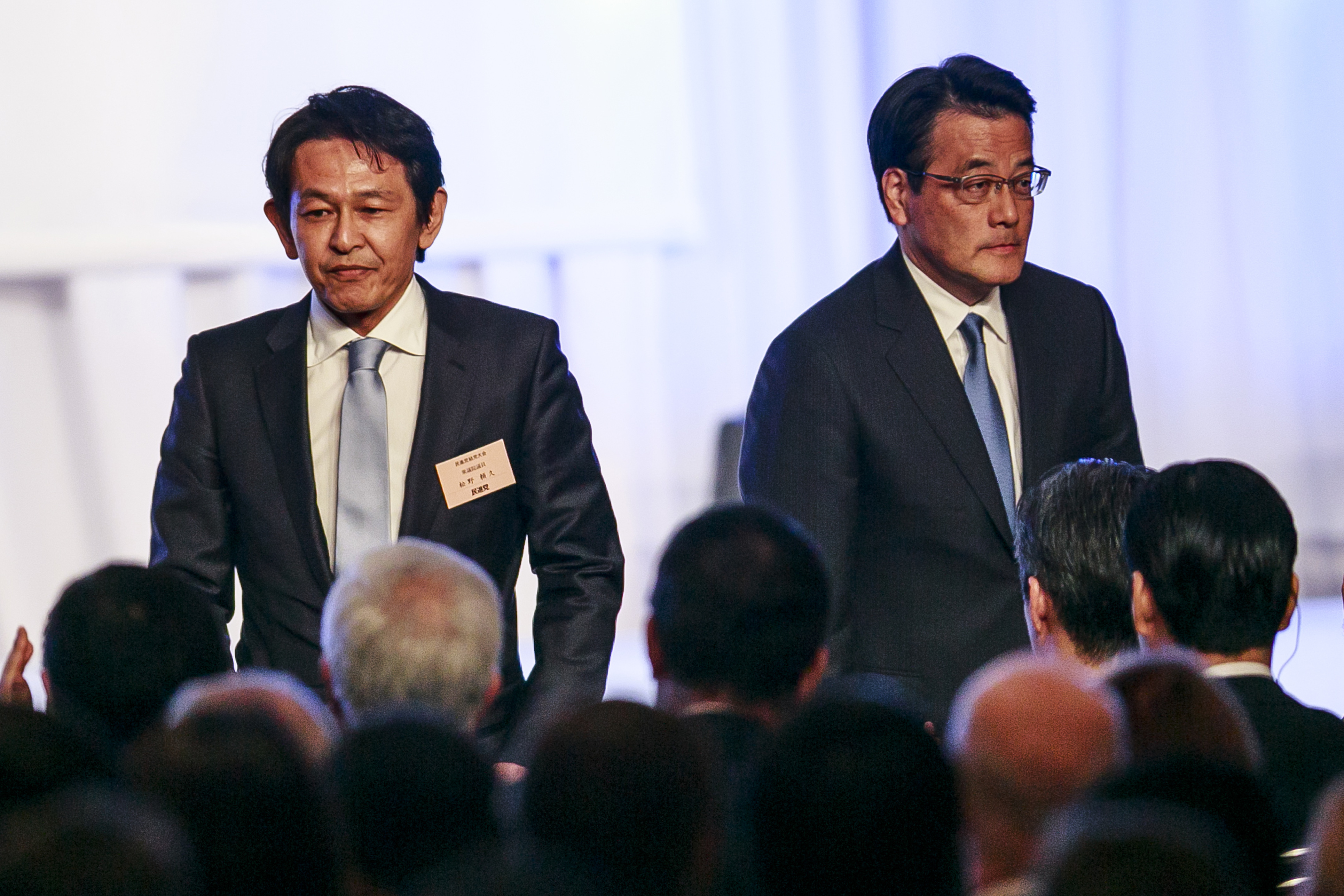 (L to R) Yorihisa Matsuno former leader of the Japan Innovation Party and Katsuya Okada leader of the new Democratic Party attend the launch of the opposition party on March 27, 2016 in Tokyo, Japan. The new party was created by the merger of the main opposition party, the Democratic Party of Japan (DPJ) and the smaller Japan Innovation Party. It will immediately become the largest opposition party with 156 sitting lawmakers since the Liberal Democratic Party (LDP) returned to power in December 2012. The new party hopes to provide a strong challenge to Prime Minister Abe’s LDP in the House of Councillors elections in the summer. (Photo by Rodrigo Reyes Marin/AFLO)